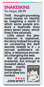 SNAKESKINS, my novel about a group of people who produce spontaneous clones, was published by Titan Books on 7th May. That seems a long time ago now! Today marks the end of an intense and intensely fascinating period – a fortnight-long marketing blitz which involved huge numbers of book bloggers and Instagrammers posting information, snippets, Q&As, giveaways and responses to the book. It’s been unlike anything I’ve experienced in the past. As I noted in my previous blog post, it took me a while (that is, all of launch day, which I frittered refreshing webpages obsessively) to understand that this process didn’t directly involve me – though of course I’d generated interview responses and blog posts etc before the event.